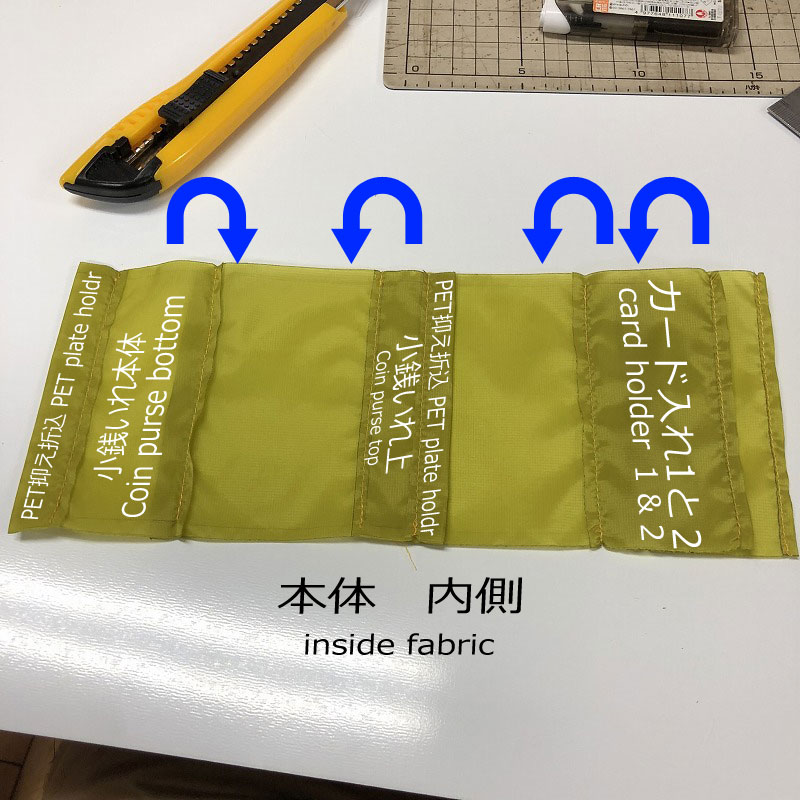 縫った後にPET板を入れるのですが、短辺が曲面になっているので、ちょっと注意が必要です。